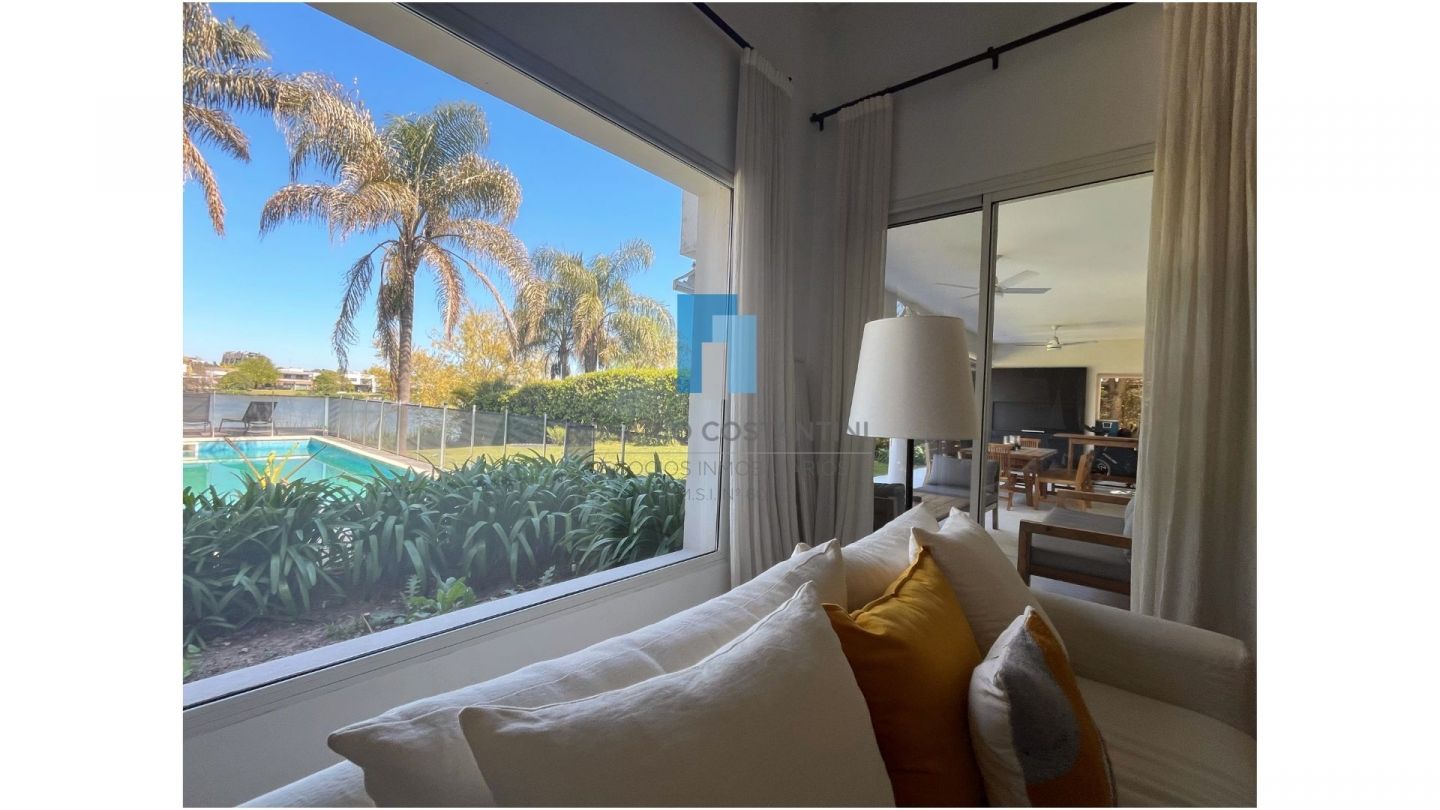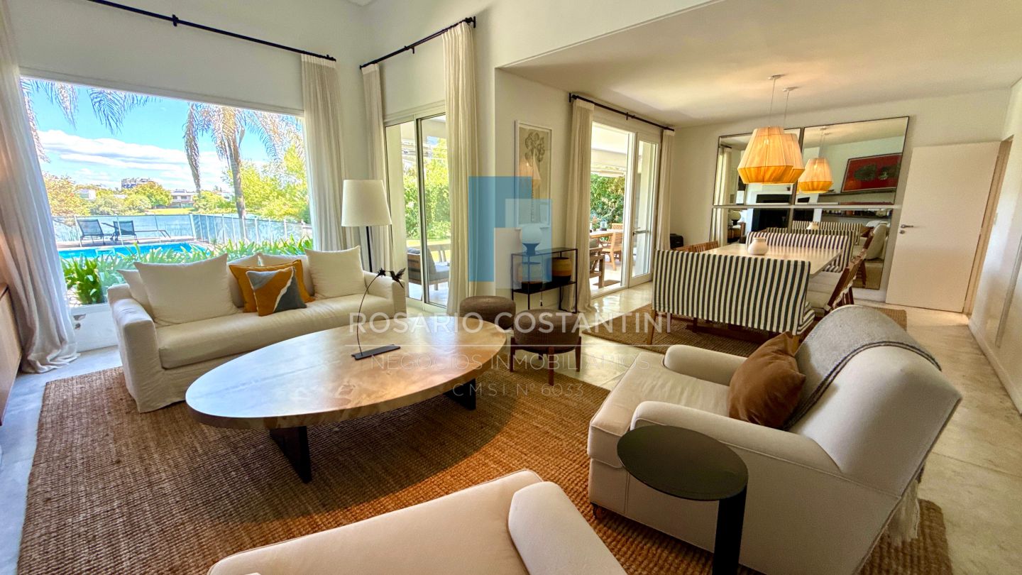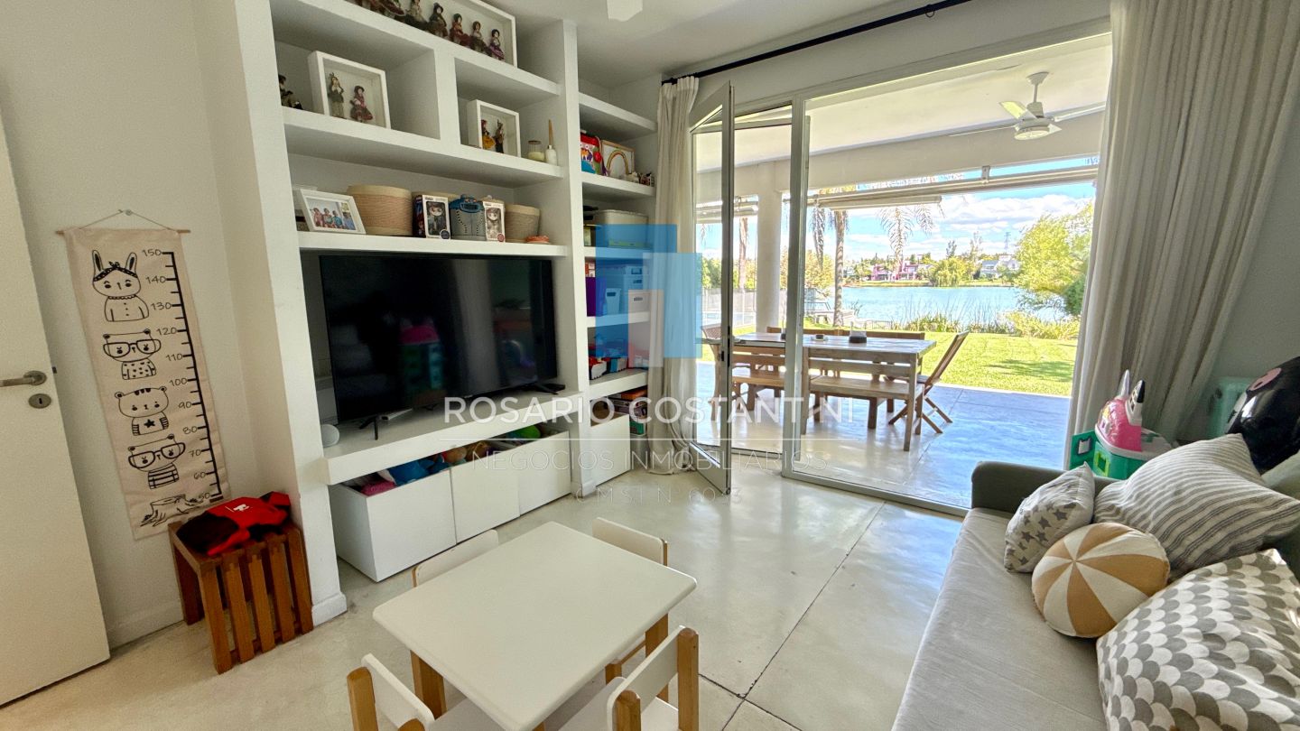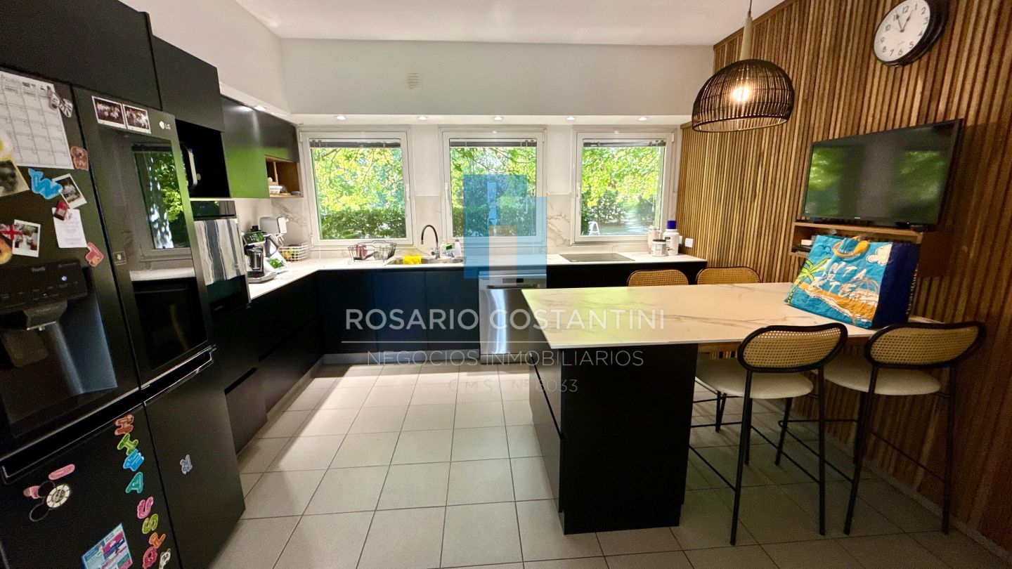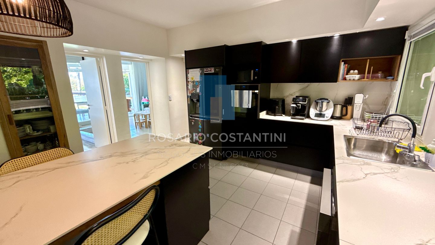 PB ; Amplio living con vista a la laguna y circulacion hacia la galeria, Cocina con barra desayunadora para 4 personas, realizada a nuevo con concepto moderno.