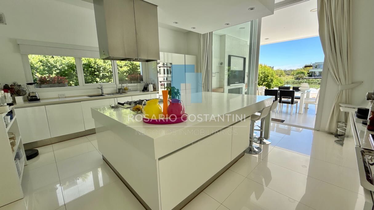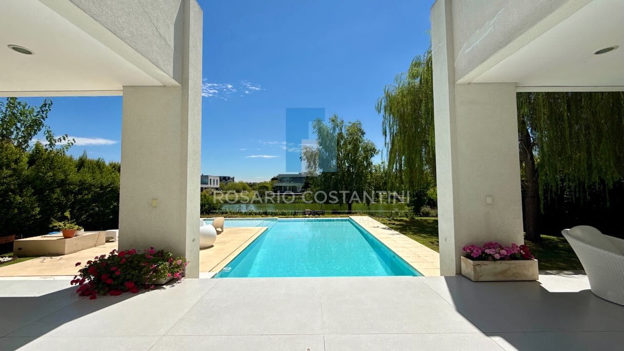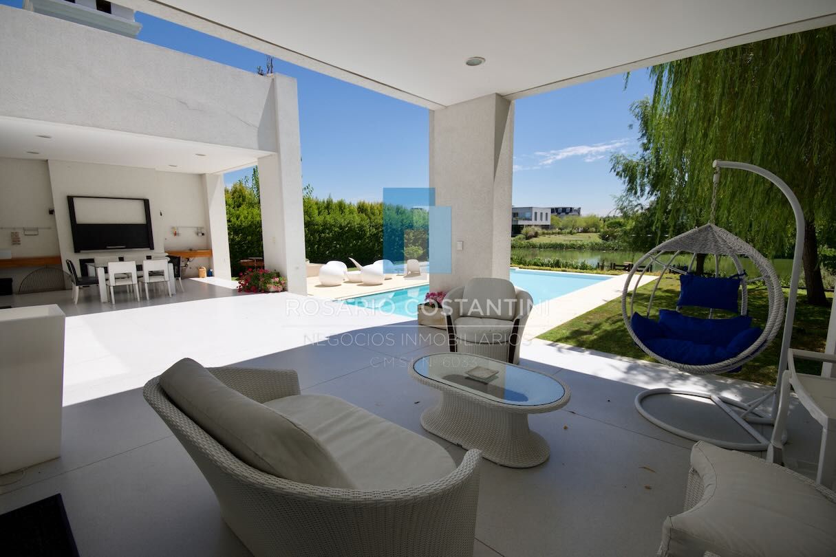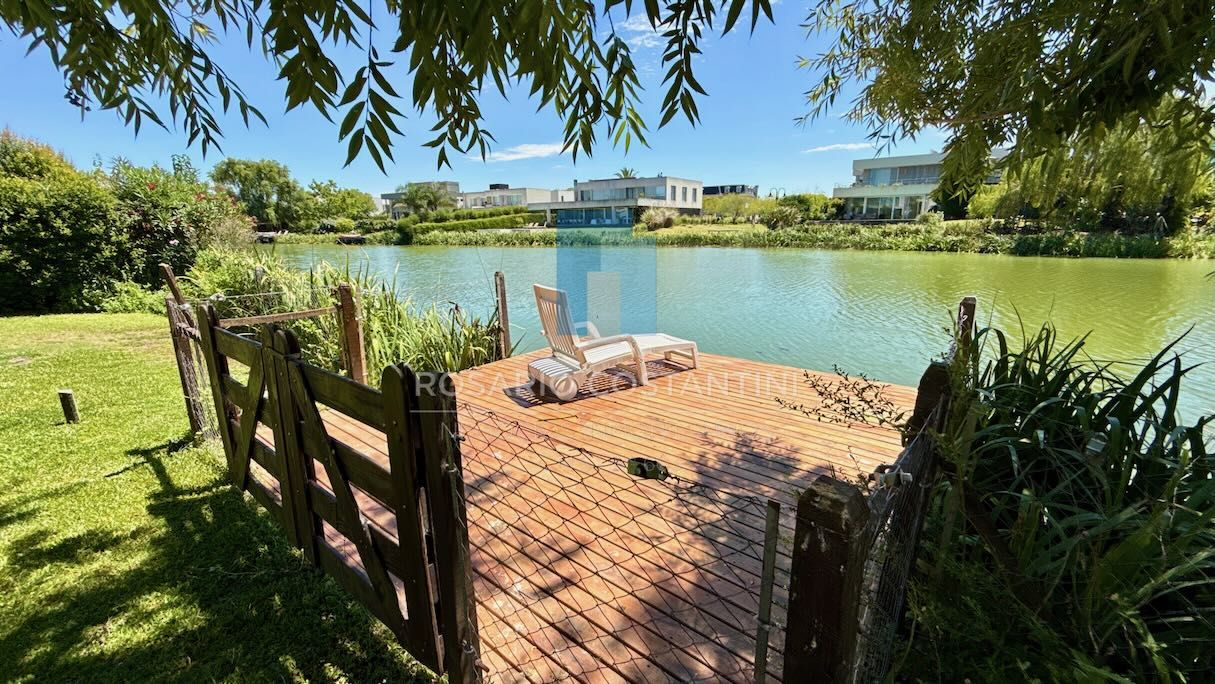 Exterior: galería doble, por un lado el espacio con parrilla y parrigas, bacha propia y espacio para mesa, espacio descubierto central y al otro lado otro espacio de galería para living o estar. Piscina climatizada con amplio descanso húmedo y piso térmico, muy linda vista al lago. Jardín parquizado y arboles que brindan espacios de sombra y privacidad. Muelle propio.