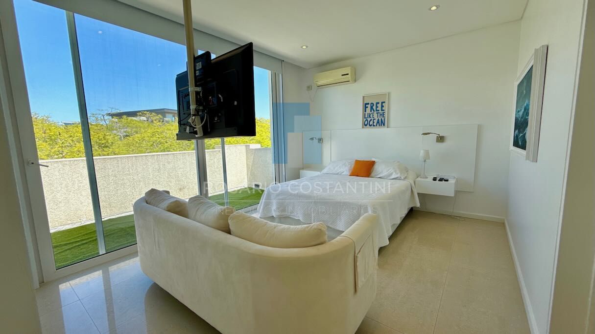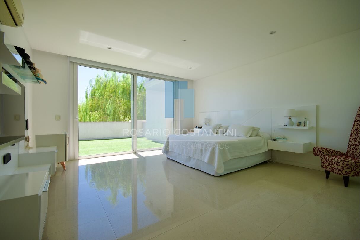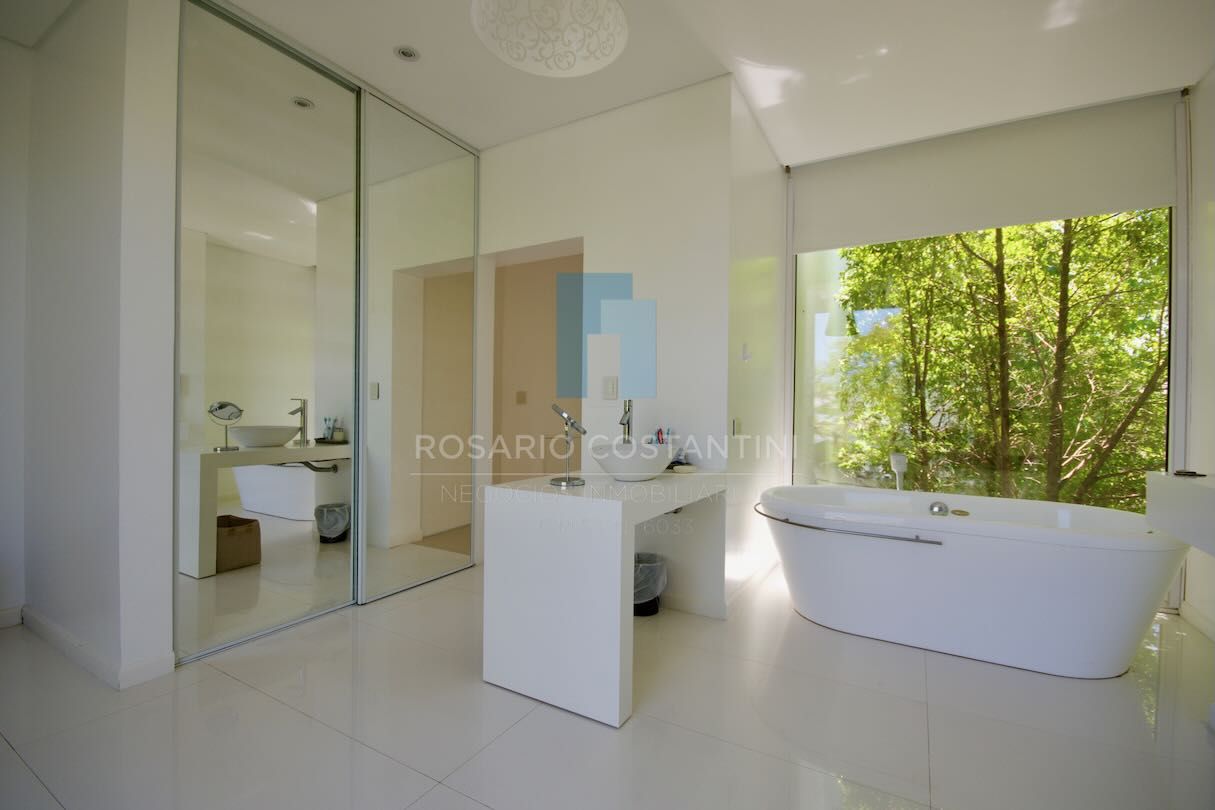 Planta alta: al subir encontramos un generoso espacio de distribución hacia las 4 habitaciones. La suite principal con terraza propia y vistas al jardín y lago, amplio espacio de placards y baño con box de ducha, horno Tromen y bañera exenta. Jr. suite con balcón y vista al frente de la propiedad. Otras 2 habitaciones que comparten un baño con doble bacha y bañera.