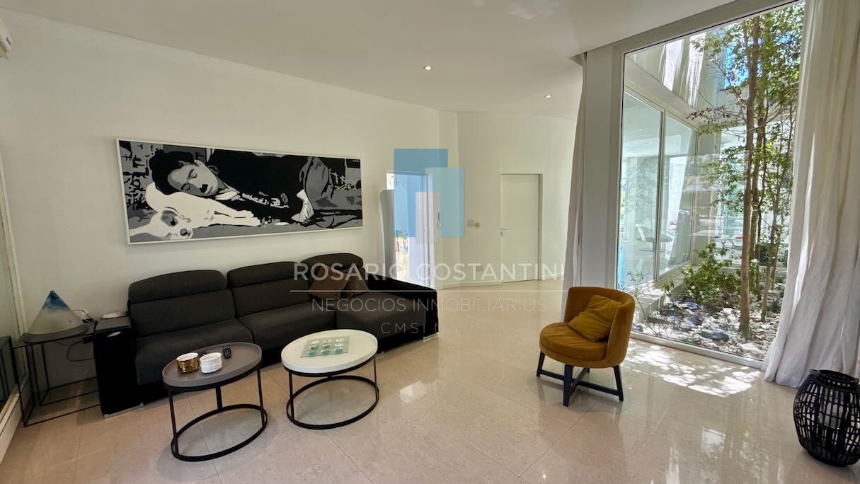 Planta baja: ingreso por doble puerta de hierro labrado y vidrio, acceso al hall de distribución con forma circular del cual se accede a la primera planta por una doble escalera con barandas de hierro. Toilette y placard de recepción. Espacio de play o escritorio. Doble altura en living comedor. Patio interno con Cocina separada con gran isla, hornallas vitrocerámicas y campana extractora SMEG, heladera panelable.