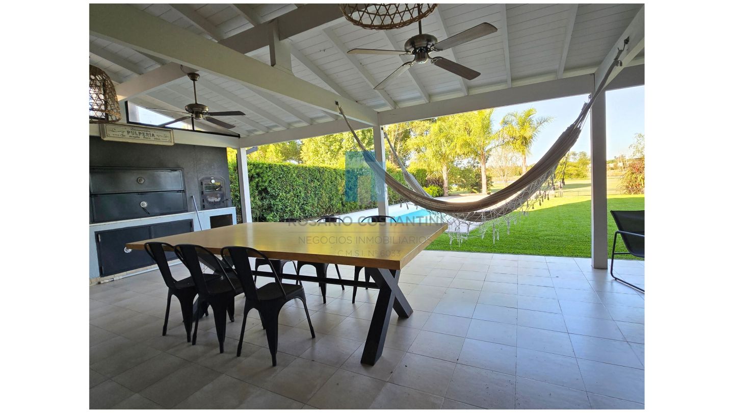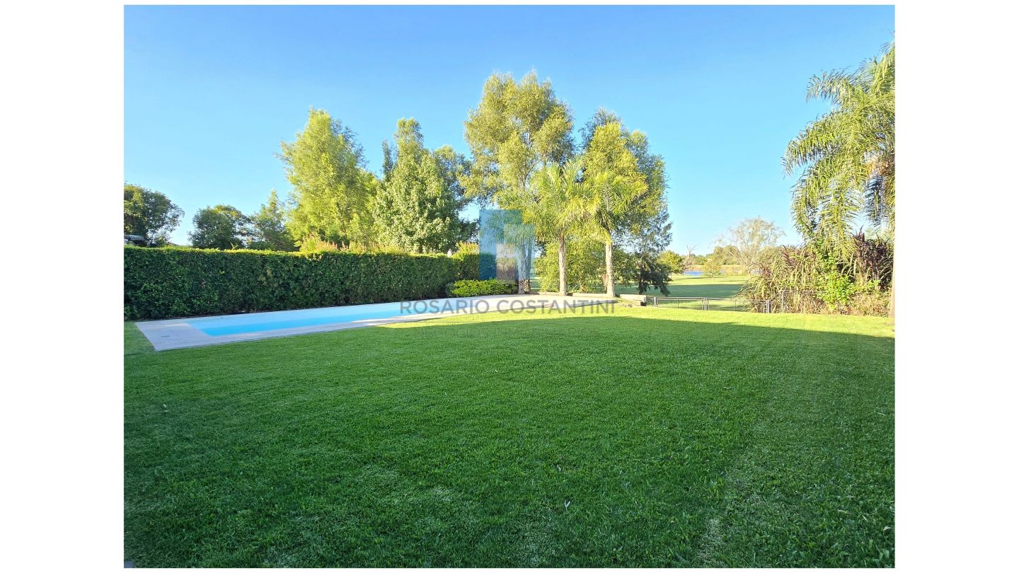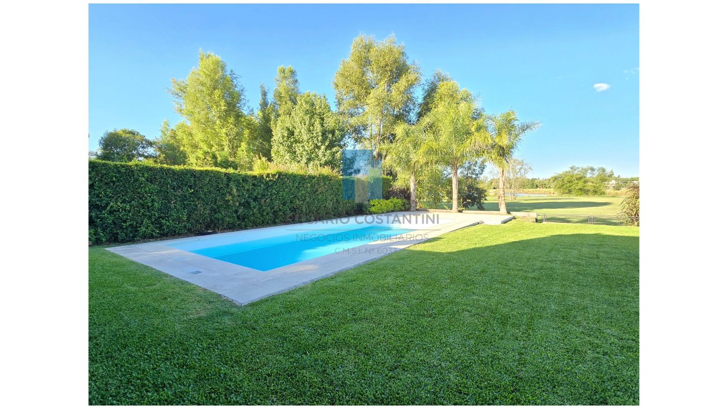 Galería amplia con parrilla, pileta y hermosa vista al golf. Césped con grama bahiana y riego por aspersión.