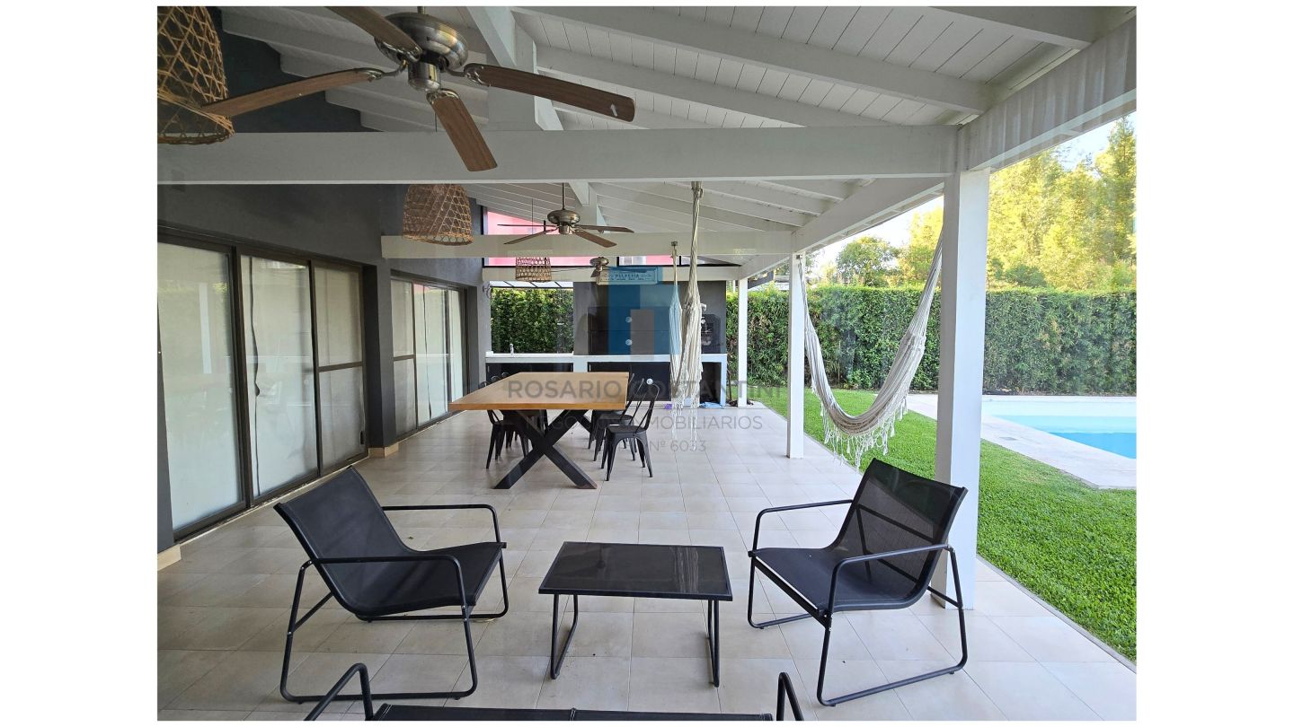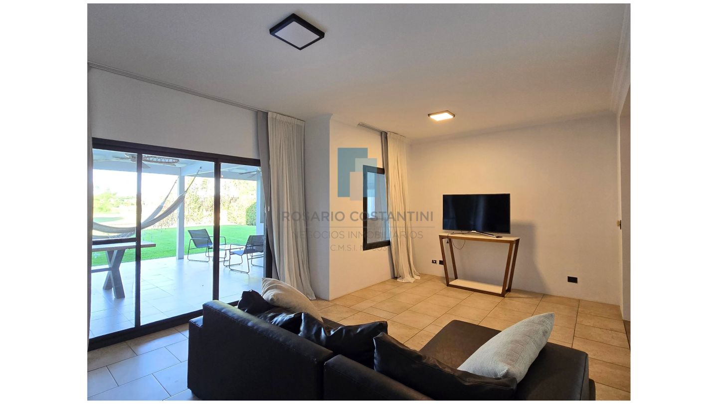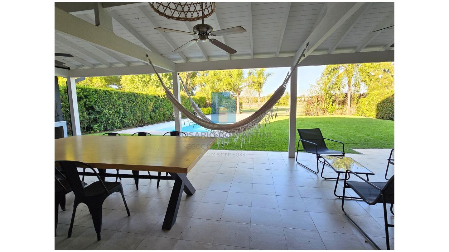 Galería amplia con parrilla, pileta y hermosa vista al golf. Césped con grama bahiana y riego por aspersión.